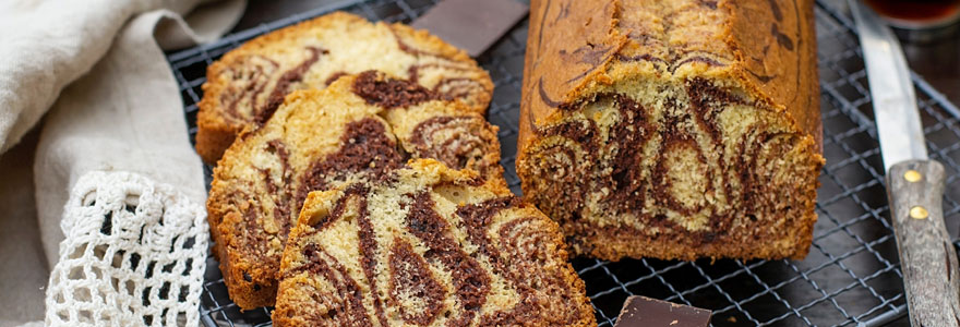 La recette d’un gâteau marbré est facile à réaliser. Pour quatre personnes, vous avez besoin de 250 g de farine, 15 g de chocolat ou cacao en poudre, 125 g de sucre glace, 2 œufs, 6 cl de lait, 80 g de beurre, 10 g de beurre pommade, 25 g de levure et une cuillerée à thé d’extrait de vanille. Séparez les jaunes et les blancs d’œufs. Battez ces derniers en neige bien ferme et gardez-les au frais. Avec un fouet, électrique ou manuel, blanchissez les jaunes avec le sucre. Ramollissez le beurre à la micro-onde ou au bain-marie avant de l’incorporer au mélange précédent. Ajoutez la farine tamisée, la levure et le lait. Avec précaution, incorporez les blancs d’œufs avec une spatule en bois. Ajoutez l’extrait de vanille dans deux tiers de la pâte, et mettez-les de côté. Incorporez le cacao dans le dernier tiers. Versez dans la moule la moitié de pâte vanillée, ensuite la pâte chocolatée, et terminez par le reste de pâte à la vanille. Mettez la beurre pommade dans une poche à douille, puis tracez un trait sur la longueur du gâteau, au milieu. Enfournez pendant 40 à 50 mn, sur la chaleur tournante à 165°. La durée de cuisson pourrait varier en fonction du four et du moule utilisés. Pour savoir si votre cake marbré est bien cuit, piquez-le en son milieu. Démoulez délicatement puis laissez le refroidir sur une grille.